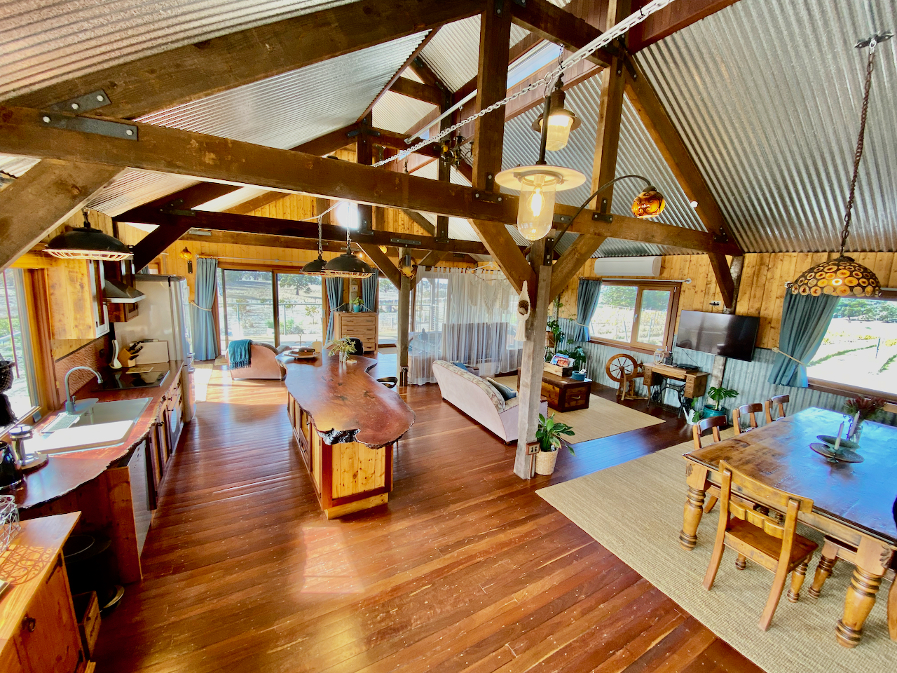 - Fully equipped, custom made solid timber kitchen using timbers from the Barn build, and recycled Marion Basketball Court floor boards. Magnificent Redgum slab benchtops milled from naturally fallen trees from our property.